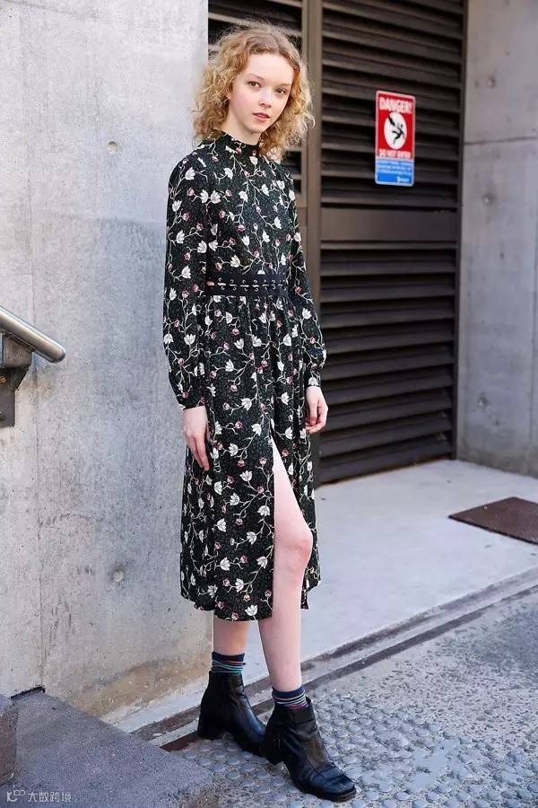 印花连衣长裙搭配短靴,柔中带酷,穿出少女范儿~等天气回温就能这么上阵了。