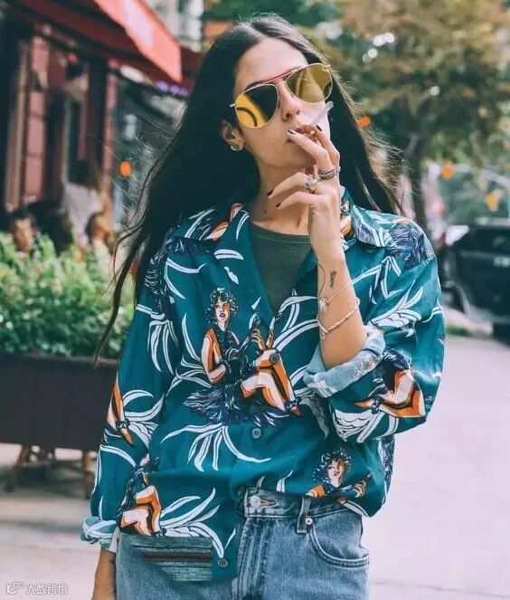 饱和度低的靛青色和大地色印花上衣,穿在身上有浓浓的复古感,搭配牛仔单品,就是轻松的时髦起来。