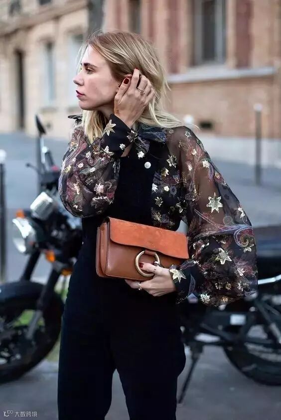 纱料的黑色印花上衣,搭配黑色背带裤,仙气中带着可爱。