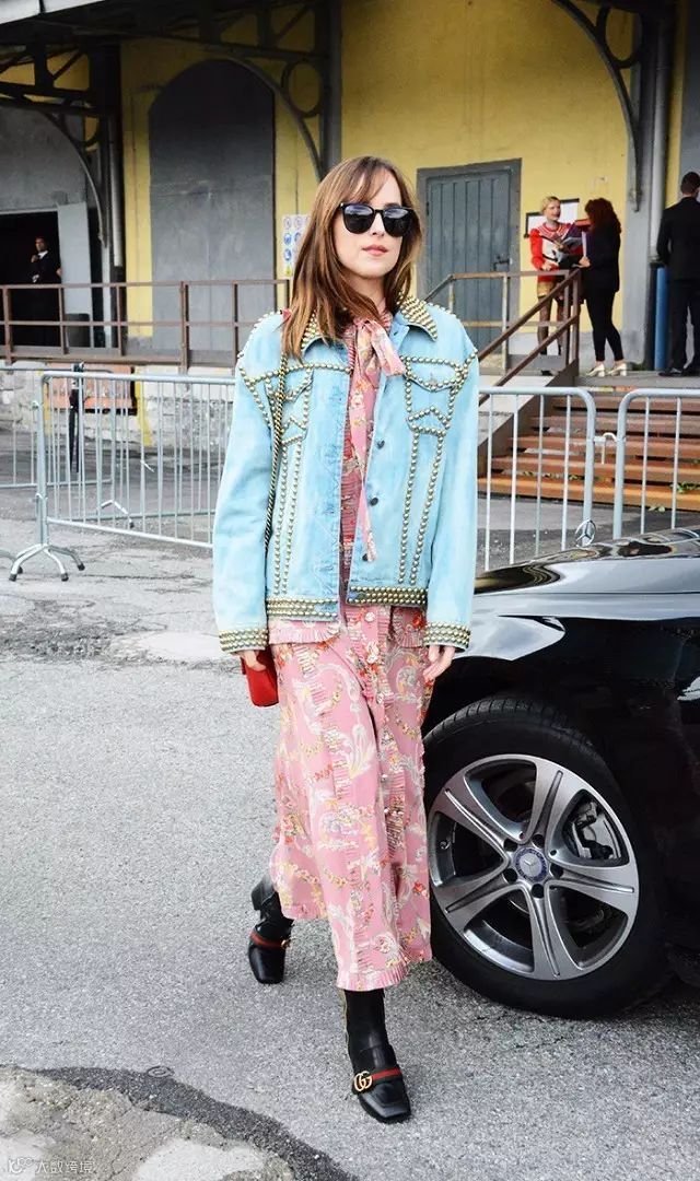 粉色的印花长裙简直美哭,搭配浅蓝色铆钉牛仔短外套+黑色打底裤+黑色单鞋,轻易的时髦着。