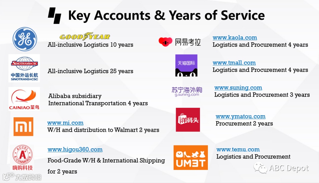 ABC Depot Logistics凭借多年的海空运干线运输、跨境物流服务经验,为全球电子商务客户提供北美销售和采购方案、海外仓平台管理、跨国运输、清关派送、亚马逊FBA等全程物流解决方案。