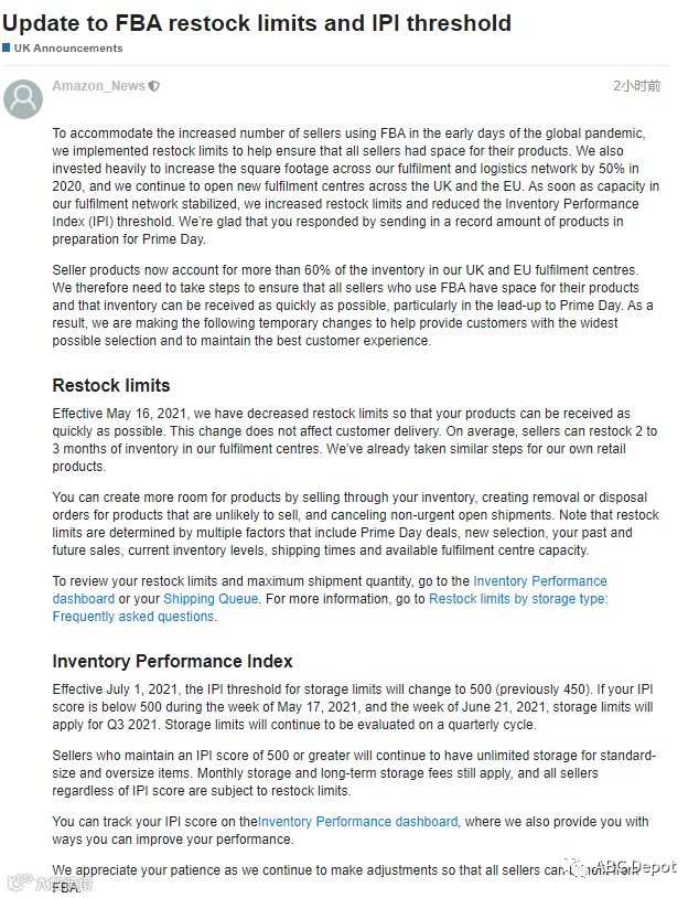 上周亚马逊欧洲站发布了新的仓储限制政策,称目前已经降低了发货数量限制的标准,并且将会在7月份调整IPI仓储绩效的阈值分数。