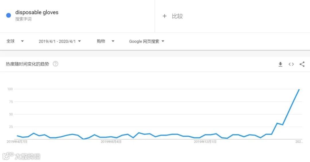 随着全球疫情的发展,对健康的关注也扩大到全球范围。根据 Google Trends 针对于全球网络用户在过去 12 个月的搜索趋势显示,“ disposable gloves 一次性手套” 和 “ sanitizer 消毒液” 在购物类别的搜索趋势自今年 3 月初开始飙升,而 “ vitamin 维生素” 的搜索量也在 3 月达到搜索的顶峰。