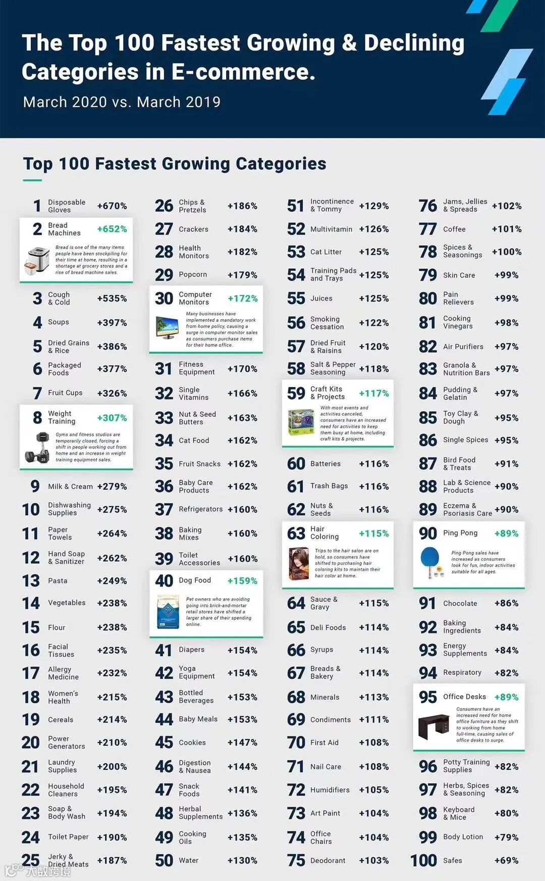 除了消毒用品和营养品以外,家用运动器材也成了疫情期间的热品。哑铃的全球电商市场需求攀升了 307%,乒乓球的市场需求增加了 89%。