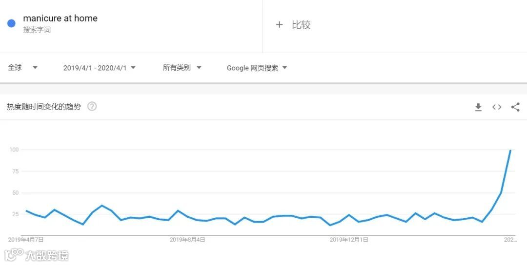 同时,“ manicure at home 在家美甲” 的搜索量也从 3 月末开始飙升至以往的四倍,指甲护理产品的电商市场需求也增长了 108%。