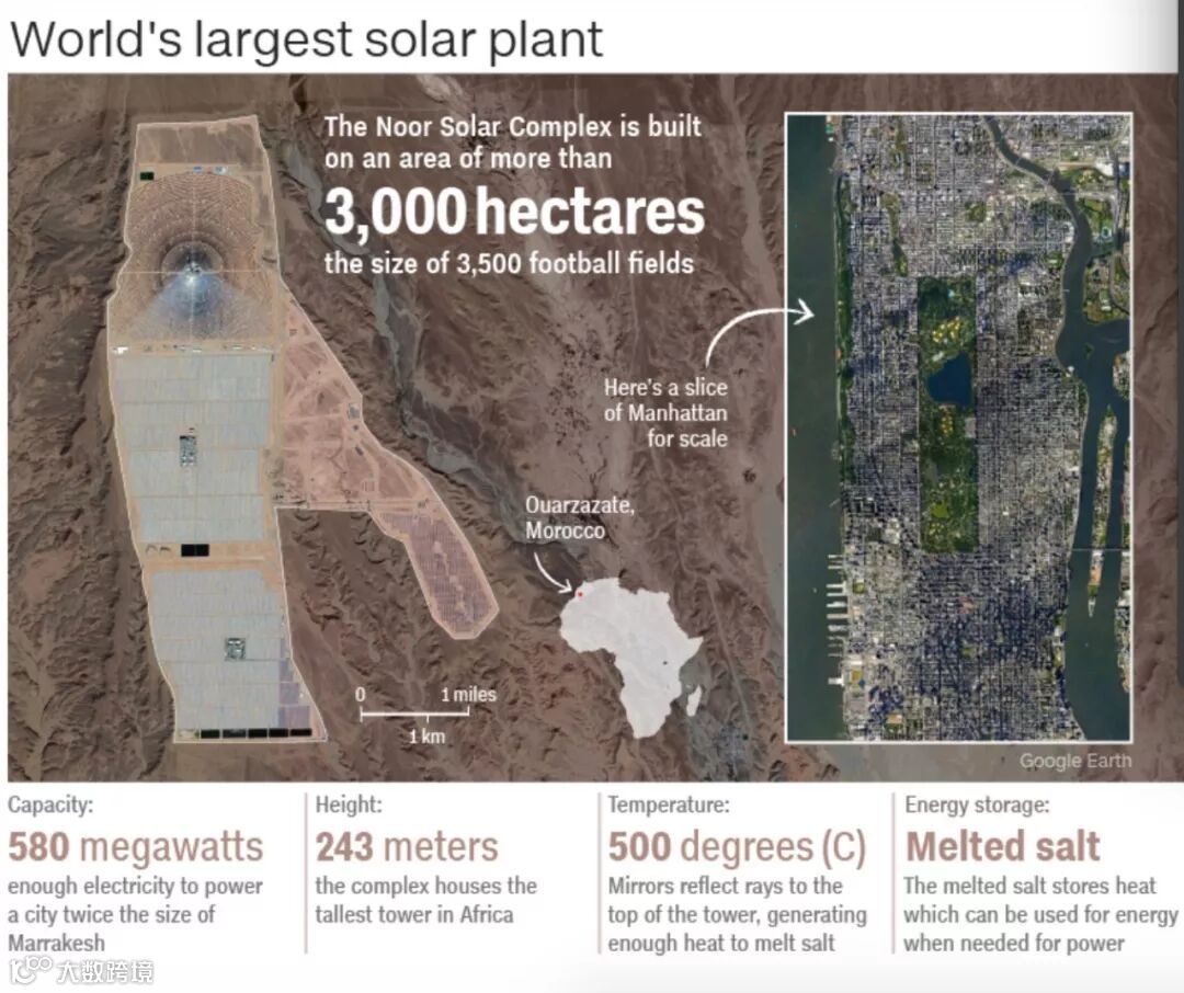 摩洛哥243米高的塔楼是非洲最高的塔楼,里面装有融化的盐,融化后可以产生能量。