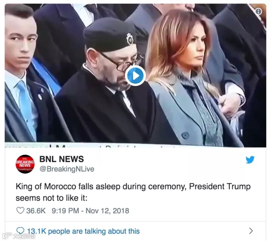 美国总统坐在梅拉尼亚和德国总理安格拉·默克尔之间,摩洛哥国王坐在梅拉尼娅另一边。特朗普望着妻子时注视着闭眼睛的国王,看上去并不欣慰。