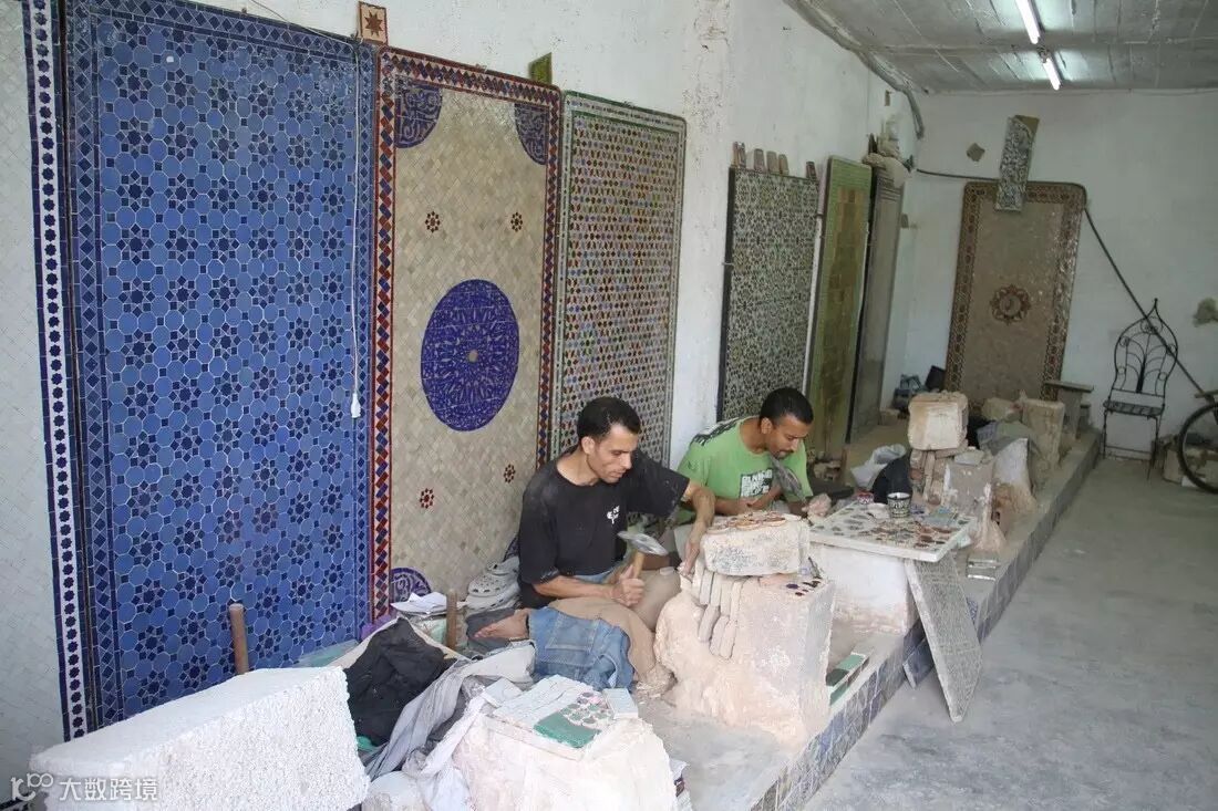 菲斯盛产以蓝色为主的马赛克,菲斯的蓝色来自于它独有的艺术品。在旧城区,随处都可以看到镶贴着蓝色马赛克的建筑,其室内装饰也繁复华丽,充满着几何象征图案。菲斯老城,被称为世界上最长的步行街和最容易迷路的地方,因为这里有9000多条大大小小的街道和巷子,穿梭在古城交错的小巷,犹如一次时空与历史的穿越。“进入菲斯老城之前,地陪再三叮嘱大家一定要跟着他走。”许源说,老城区以中世纪建筑为主调,从10世纪起就是阿拉伯人的聚居区。在聚居区里,小巷完全没有规则和方向,大巷套着小巷,小巷可以接着更小的巷,也会豁然走入大巷,通向干道。在那里,几乎找不到直路,三步一斜、五步一转,有的小巷狭窄到只可容一人侧身而过。