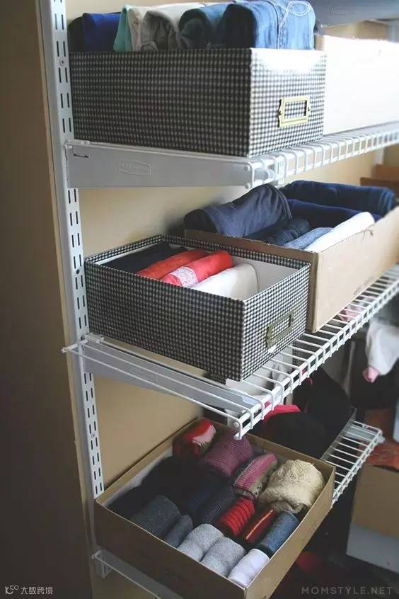 还有一些零碎的小东西,她则建议用形状大小各异的盒子装起来,而且,身边也要常备收纳盒,以备不时之需。比较厚重的毛衣,悬挂容易变形,建议直接折叠放在衣柜就好。