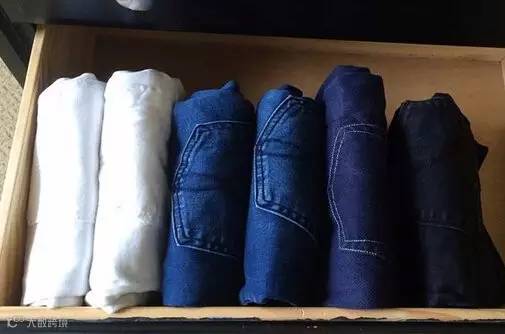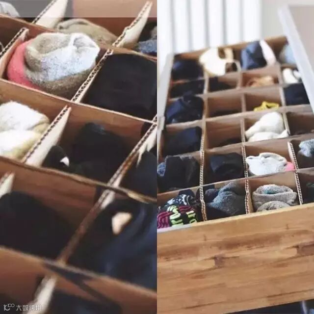 比较薄的衣物,如T恤,干毛巾等,可以用平时包装用的瓦楞纸来存放。做成纵横相间的隔板,单个放置,也可以根据颜色来摆置衣物。