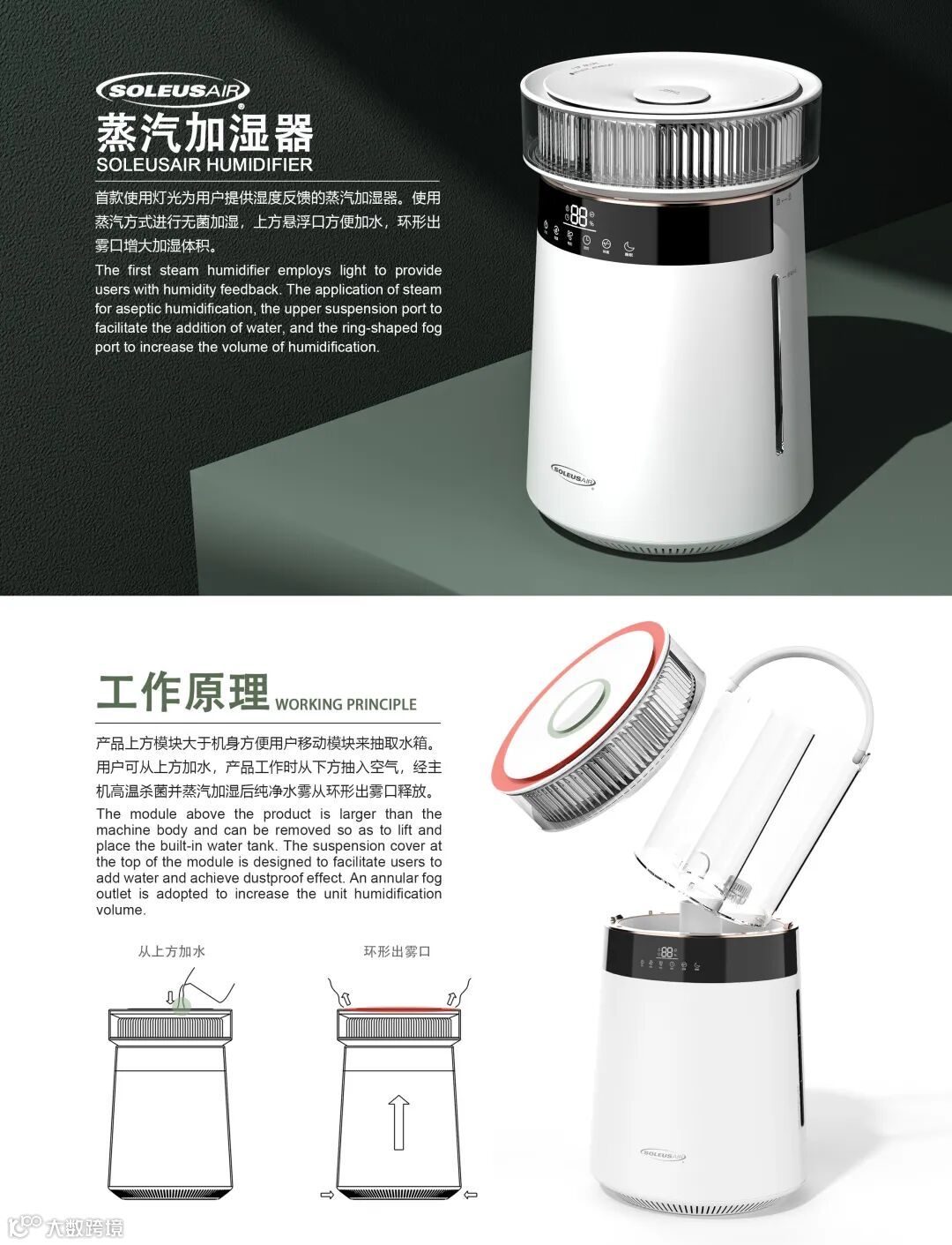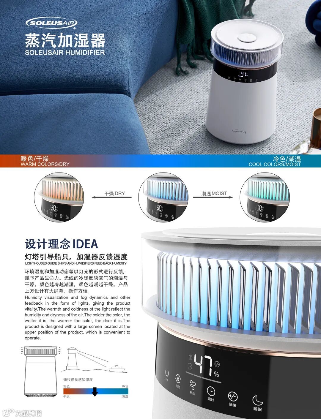 这个加湿器的设计非常有意思,它实际上是一种仿生的设计语言,像一个蘑菇。而且,淡淡的蓝色灯光给人一种新鲜空气的感觉,它不仅仅是一个加湿器,还可以带来一种非常亲切而又温馨的感受。除此之外,每一个细节都设计得非常到位,做得非常精致,这些细节,同时也具有功能性,并非纯粹的装饰,所以这是一个很好的设计。