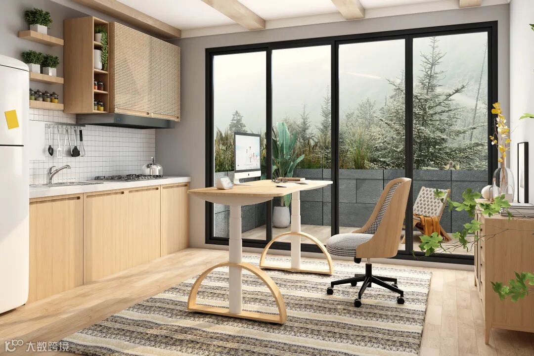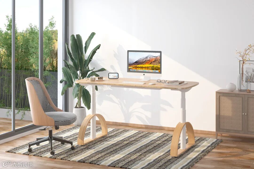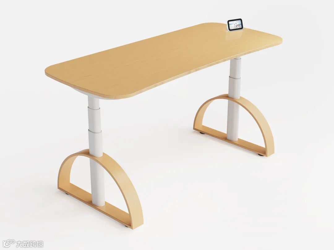这张升降桌,它最大的特点是从用户健康角度来设计。我们都知道,大家由于办公和休闲都要高频使用电脑和手机,坐的时间太长,站立和运动太少,就会导致颈椎、四肢等不适和出现亚健康状态,这张桌子的升降设计刚好可以缓解这些问题,让你更健康地办公学习。另外,材料使用和外观设计上来说,它采用了竹材料,运用了竹子的这种柔性特性,非常绿色环保,整个设计非常简洁,充分展现了这个产品绿色、健康的设计理念。