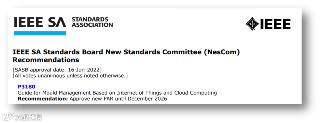 6月16日,IEEE官网公布,由卡奥斯COSMOPlat牵头的全球首个模具管理国际标准IEEE P3180《Guide for Mould Management Based on Internet of Things and Cloud Computing》,经由IEEE SA(电气与电子工程师协会标准协会)新标准委员会投票通过,正式立项。该标准的启动历时四年,填补了模具管理领域的国际空白,也提高了我国在智能制造标准领域的国际竞争力。