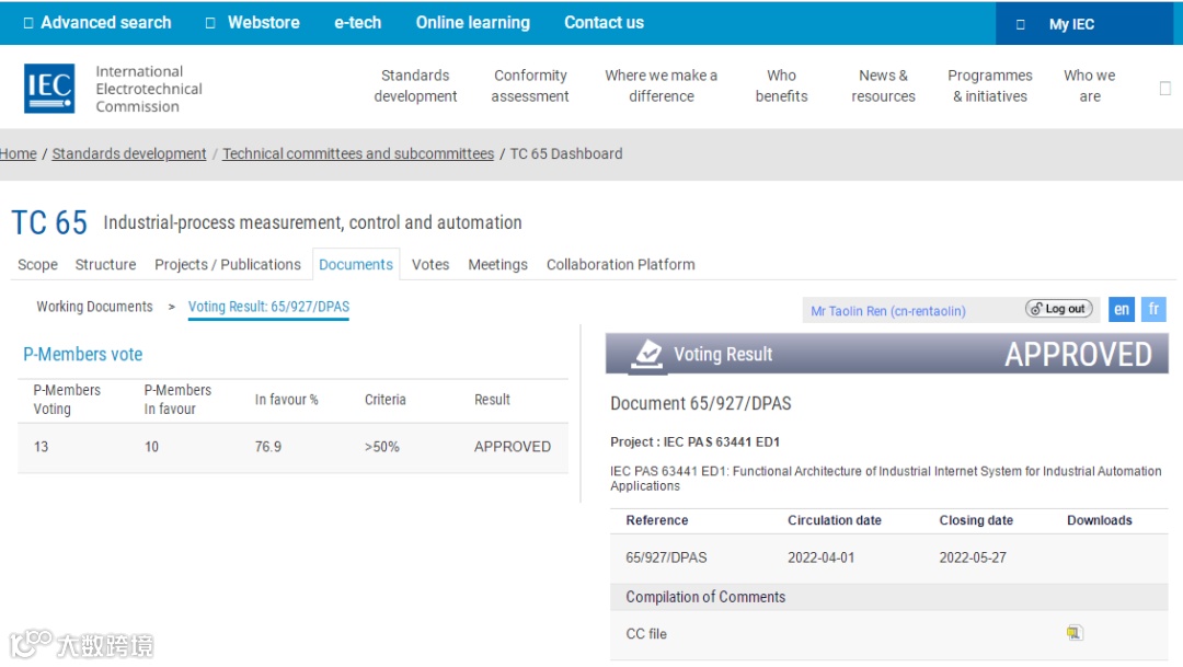 5月28日,IEC官网公布,由卡奥斯COSMOPlat联合机械工业仪器仪表综合技术经济研究所牵头制定的全球首个工业互联网系统功能架构国际标准IEC PAS 63441《Functional Architecture of Industrial Internet System for Industral Automation Applications》通过IEC/TC65(工业测控和自动化)投票,预计在2022年年底正式发布。
