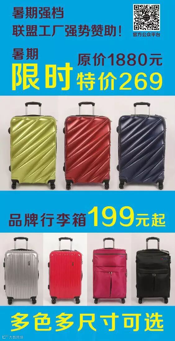 暑期强档,联盟工厂强势赞助!行李箱超低价格,品牌行李箱199元起,多款可选,拉着我去旅行吧!
