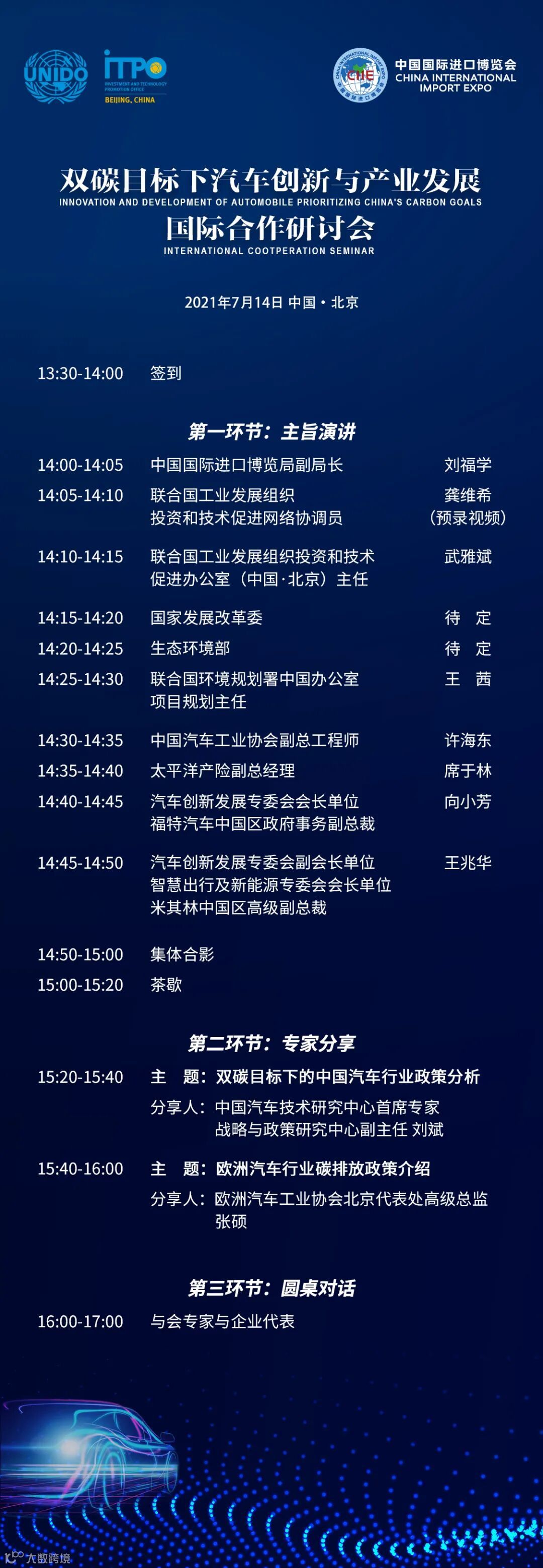 为深化企业产业创新与发展的国际合作,推动中国“双碳”目标的实现,第四届进博会参展商联盟-汽车创新发展专业委员会与UNIDO ITPO Beijing于2021年7月14日下午共同主办“双碳目标下汽车创新与产业发展国际合作研讨会”。出行领域国际领军企业将同行业利益攸关方开展高层对话,分析“双碳”目标下汽车产业的创新机遇和国际合作前景,多角度为包容与可持续发展进言献策。