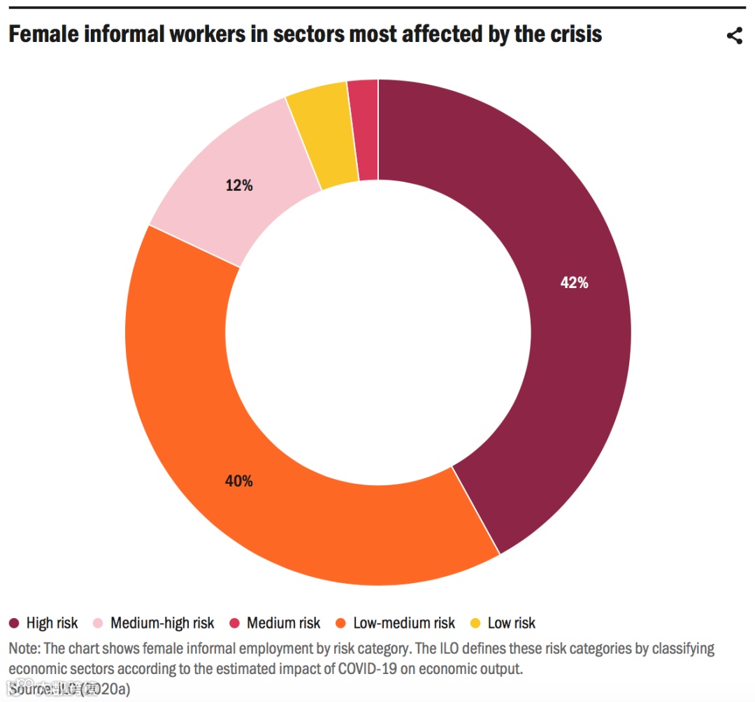 Self-employed and informal workers, who are often suppliers of manufacturing firms, have also been forced to halt their activities, thus undermining their livelihoods and leaving them with little or no social protection to fall back on. Women working in the informal economy are overrepresented in sectors hardest hit by the crisis (42 per cent compared to 32 per cent of men). The situation is particularly acute in lower and upper middle-income countries, where 56 per cent of women work in high-risk sectors compared to 39 per cent of men.