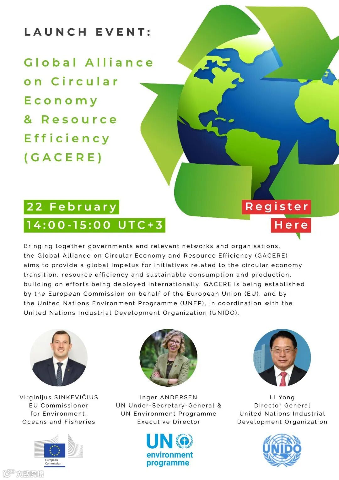 全球循环经济与资源效率联盟(GACERE),由欧洲委员会代表欧洲联盟(EU),联合国环境规划署(UNEP)及联合国工业发展组织(UNIDO)共同协调,推动建立,旨在将政府、相关国际组织与网络召集在一起,为与循环经济转型、资源利用效率、可持续消费和生产模式以及包容与可持续工业化有关的倡议提供全球动力。