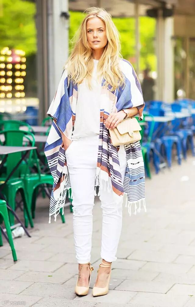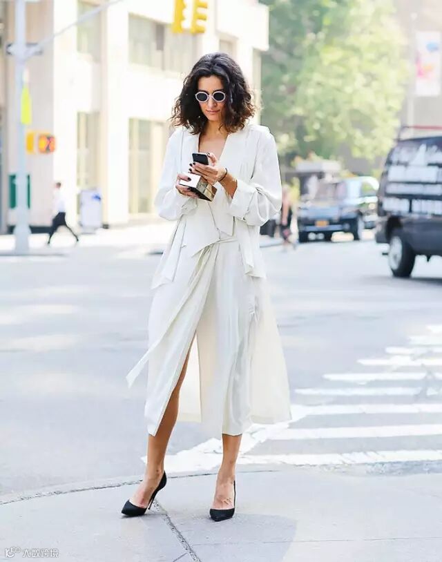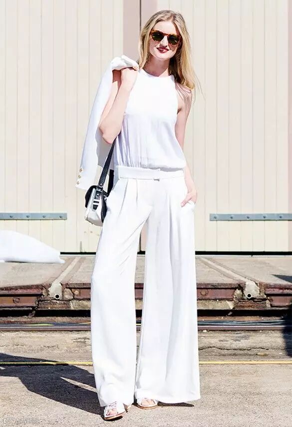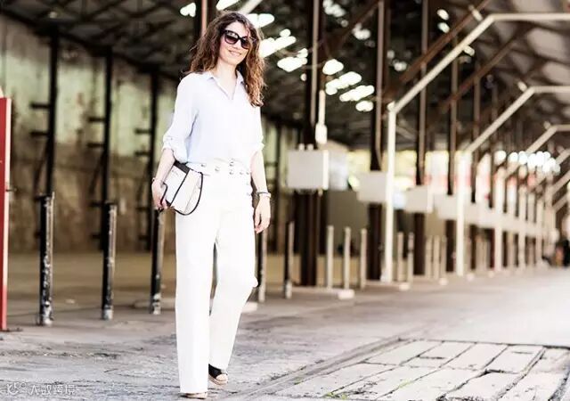 有人说白色太难穿,穿不好就显胖、显黑。其实这只说对了一半,确实,如果搭配不当会显得上下身比例失调,同时还会显得小腿粗。但是如上图般的白色宽松罩衫+白色微喇叭裤的造型,遮掉了尴尬的腰部赘肉,同时也显得人高挑了。