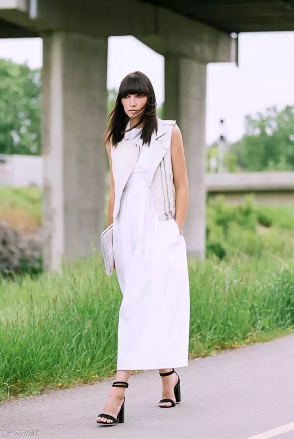 原本摇滚范儿十足的机车夹克,因白色的加入而更显柔和。同时搭配长款连身裙,以及适当的露肤度,也别有一番女人味。