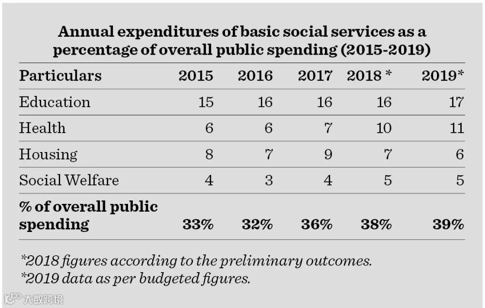 The spending estimated in 2019 budget for basic services, such as education, health care, housing and social welfare accounted for 39% of public spending, which represents the largest portion of the budget. The following table shows the public spending on the aforesaid services during (2015-2019):