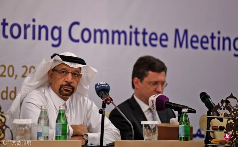 沙特阿拉伯能源部长法利赫(左)和俄罗斯能源部长诺瓦克出席在吉大举行的石油输出国组织成员与非成员会议。(法新社)