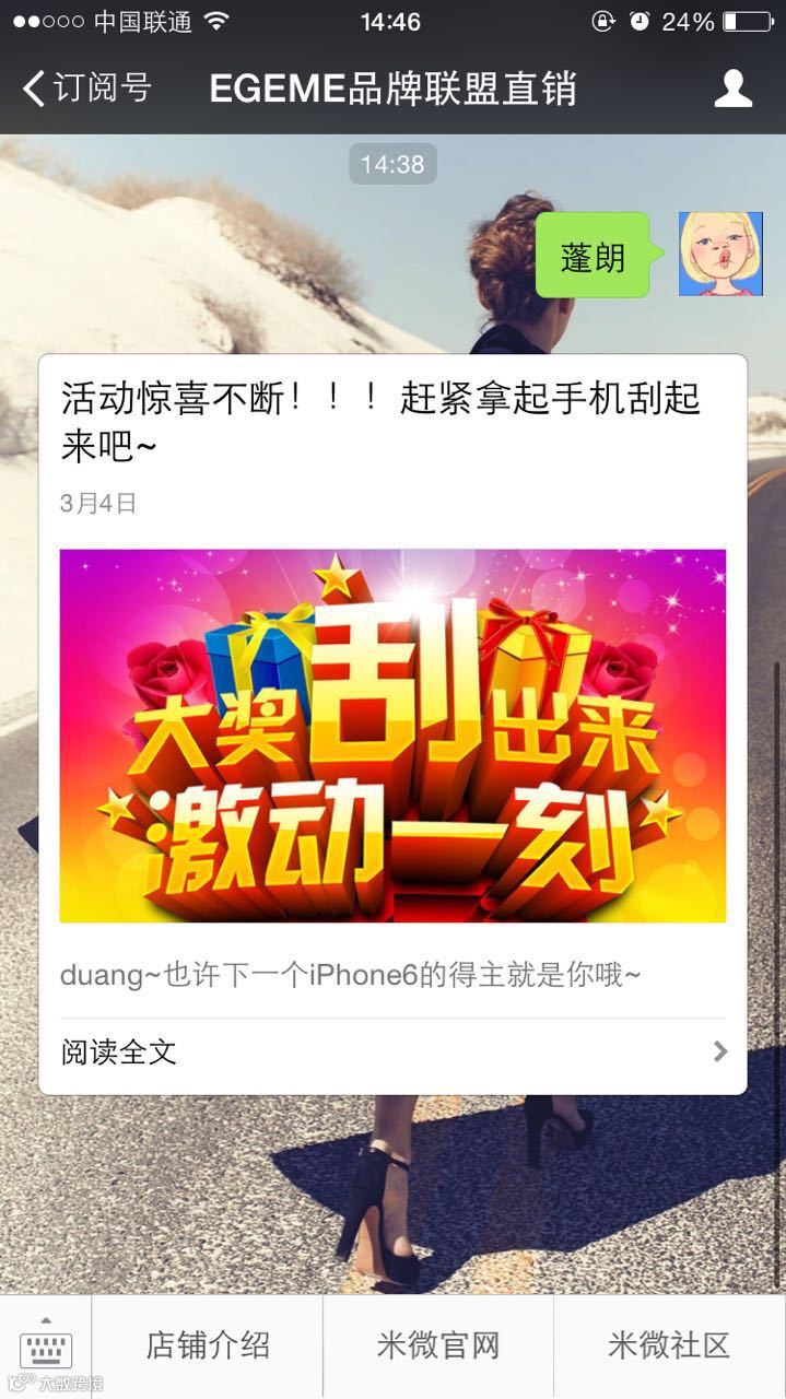 顾客进店扫描二维码,关注并回复所在店名即得刮刮卡一张(如回复:蓬朗),每个手机每天仅限一次!