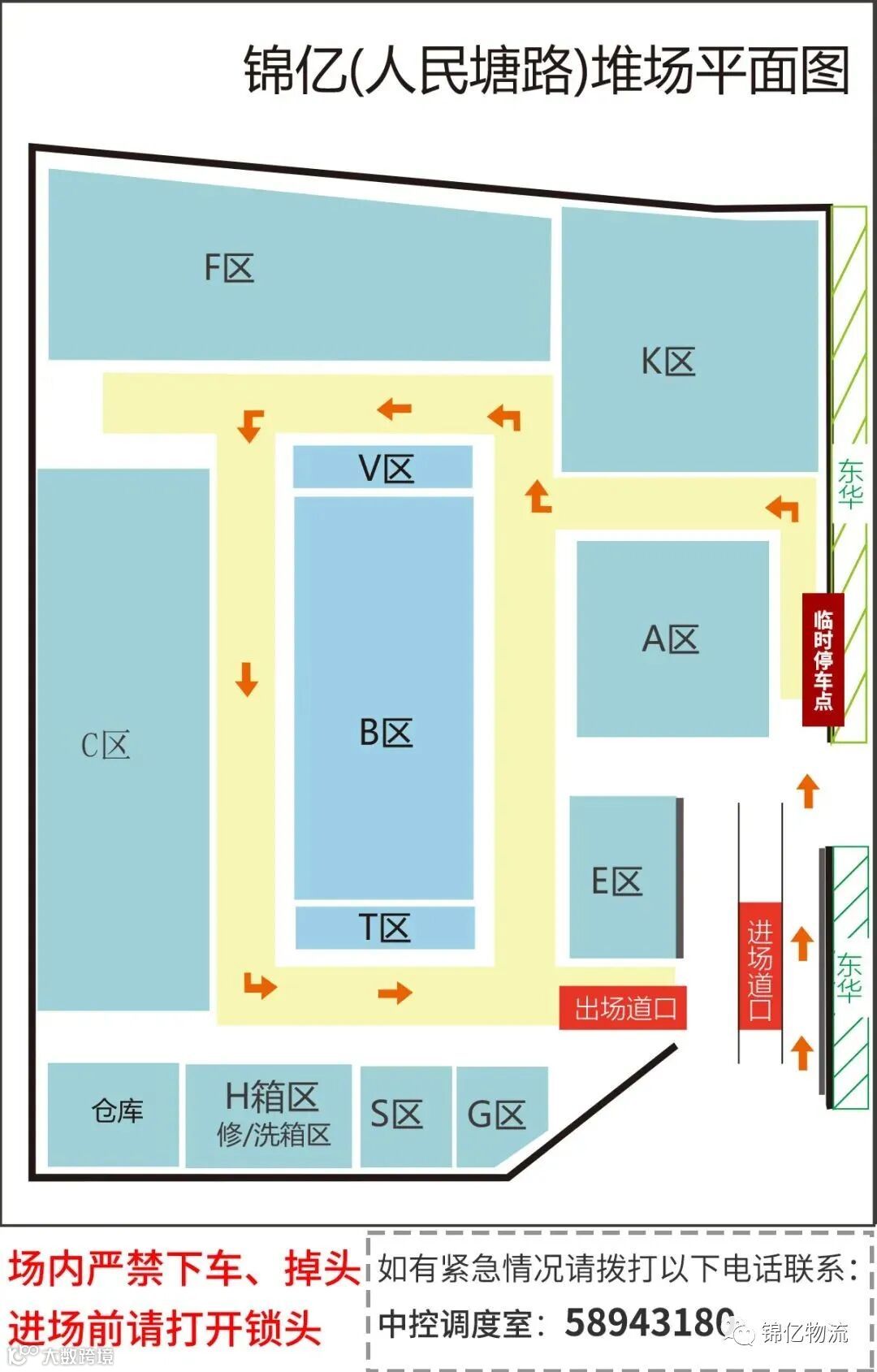 锦亿人民塘路堆场内部车道改为单向行驶,请驾驶员按道路标识行驶,保障现场安全有序。场位图如下: