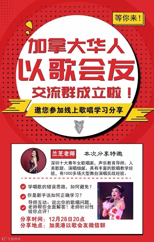 加美港&兰翼以歌会友群,加拿大温哥华18年12月28号晚上8点,兰翼音乐导师、青年女高音兰芝老师光临本群,与群友分享交流唱歌经验,加美港活动中心地处大温列治文赌场天车站附近,详细地址:8971 Beckwith rd,本中心定期有免费的活动,KTV跳舞打牌打乒乓等娱乐,欢迎加入我们的群,请加微信:camekong888