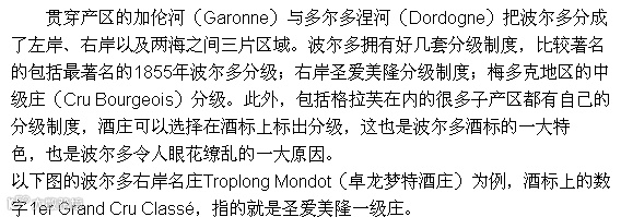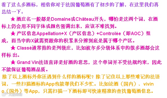 ④ Saint-Emillon Grand Cru:圣爱美隆特级园产区。这里要注意,St Emillion Grand Cru是个AOC的名字,在当地符合法律规定、可以标示“St Emillion Grand Cru”的酒有两百 款之多,但并不是每个有此标示的酒都是“圣爱美隆列级庄”。分辨是不是圣爱美隆列级庄 的诀窍是看酒标上有没有“Classé”这个词。