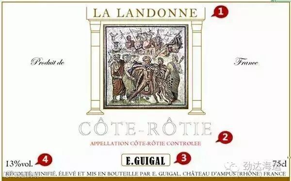 ② 酒标上最醒目的是产区名:罗第丘(Cote Rotie),除此之外,北罗著名的产区还包括埃米塔日(Hermitage)、科尔纳斯(Cornas)、孔德里约(Condrieu)、克罗兹-埃米塔日(Croze-Hermitage)。记住以上这些名字有利于看懂酒标。