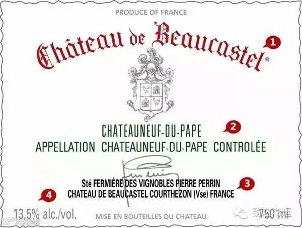 ① Château de Beaucastel:酒庄名以花体红字标示。
