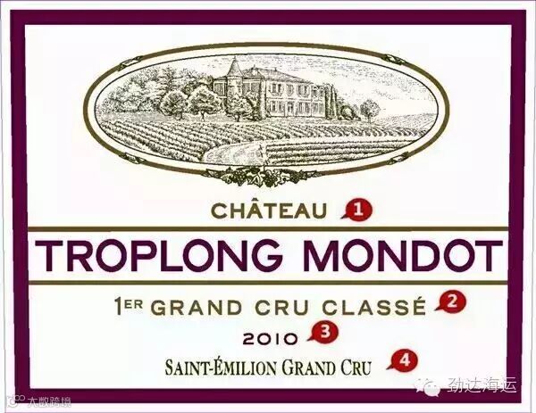 ① Château Troplong Mondot:酒庄名(中文译为:卓龙梦特庄园),其中Château是法语中城堡的意思,波尔多的酒庄命名规则一般是Château(城堡)+酒名