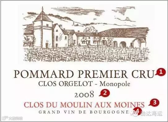 ① 产区信息:Pommard是村名。换行的Clos Orgelot是田名,是一片一级独占园的字。在勃艮第,酒庄可以选择是否在酒标上显示葡萄园的信息。