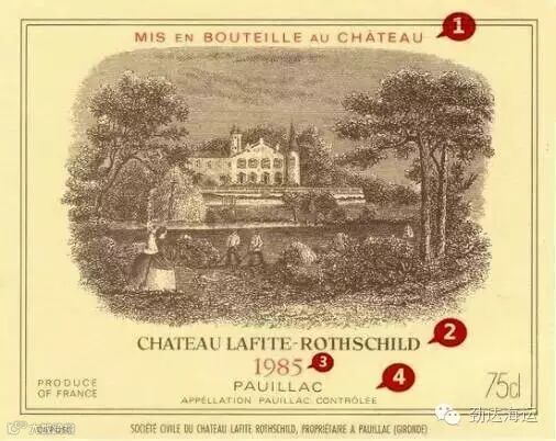 ① 装瓶信息“Mis(e) en Bouteille au Château”(意为在酒庄装瓶,bouteille是瓶子的意思),此外常见的还有“Mis(e) en Bouteille a la Propriéte”(在酒庄装瓶),个人装瓶“M is(e) en Bouteille par XXX(人名)”(由特定酿酒师灌装)。