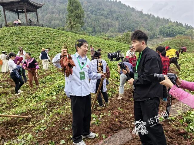 锄头在田里翻飞,一个个饱满新鲜的红薯从泥土中挖出,网红们现场直播、拍摄、体验……这是11月15日,彭水晶丝苕粉短视频大赛暨网红采风的现场,各路网络达人、美食博主来到田间地头,打探彭水苕粉的制作,为当地“土特产”晶丝苕粉宣传助力。