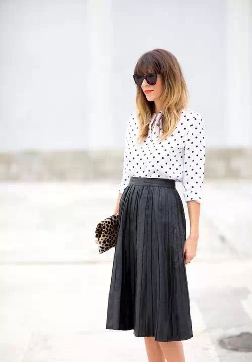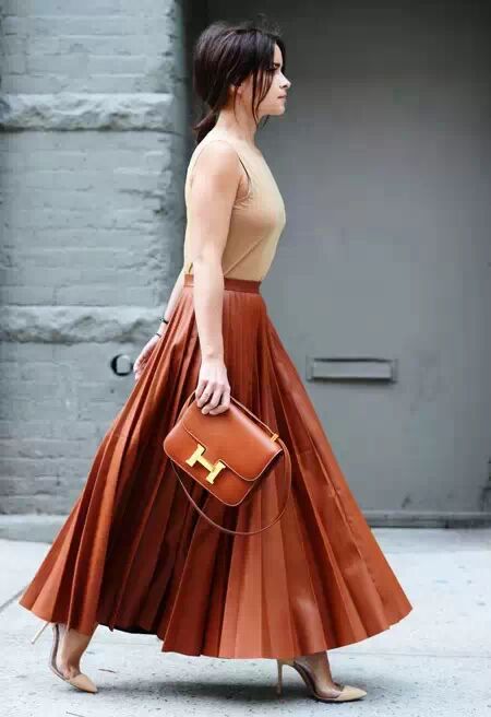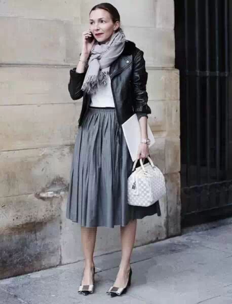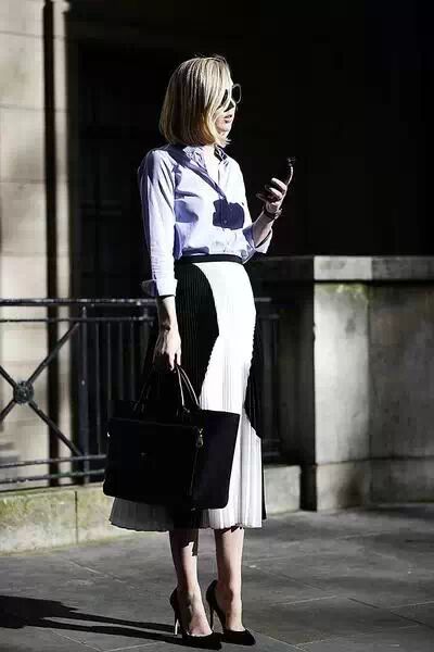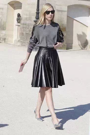 稍留意下你便会发现,近两年那些金属感面料的百褶裙大肆流行起来。但困惑也随之而来:反光面料特别凸显腹部!所以更建议选择略长的上衣,遮掉赘肉哦!