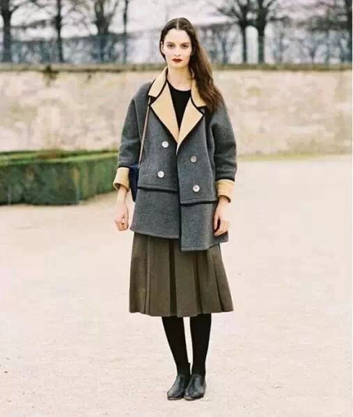 2 露出一截裙摆,将百褶裙衬在大衣里!