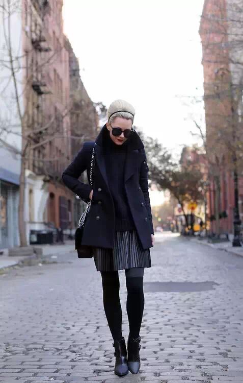 6 选择显瘦深色搭配,外套盖过百褶裙挡住腰部赘肉