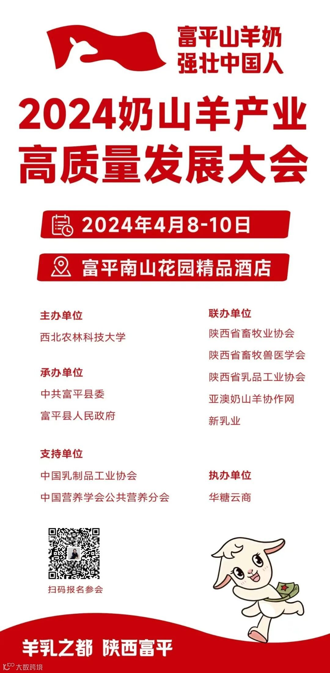 4月8-10日,“2024奶山羊产业高质量发展大会”即将隆重召开!诚邀全国优质采购商、上下游伙伴齐聚“羊乳之都”陕西富平,倾听羊故事,感受羊文化,投身羊产业,共创羊品牌,共享羊财富!