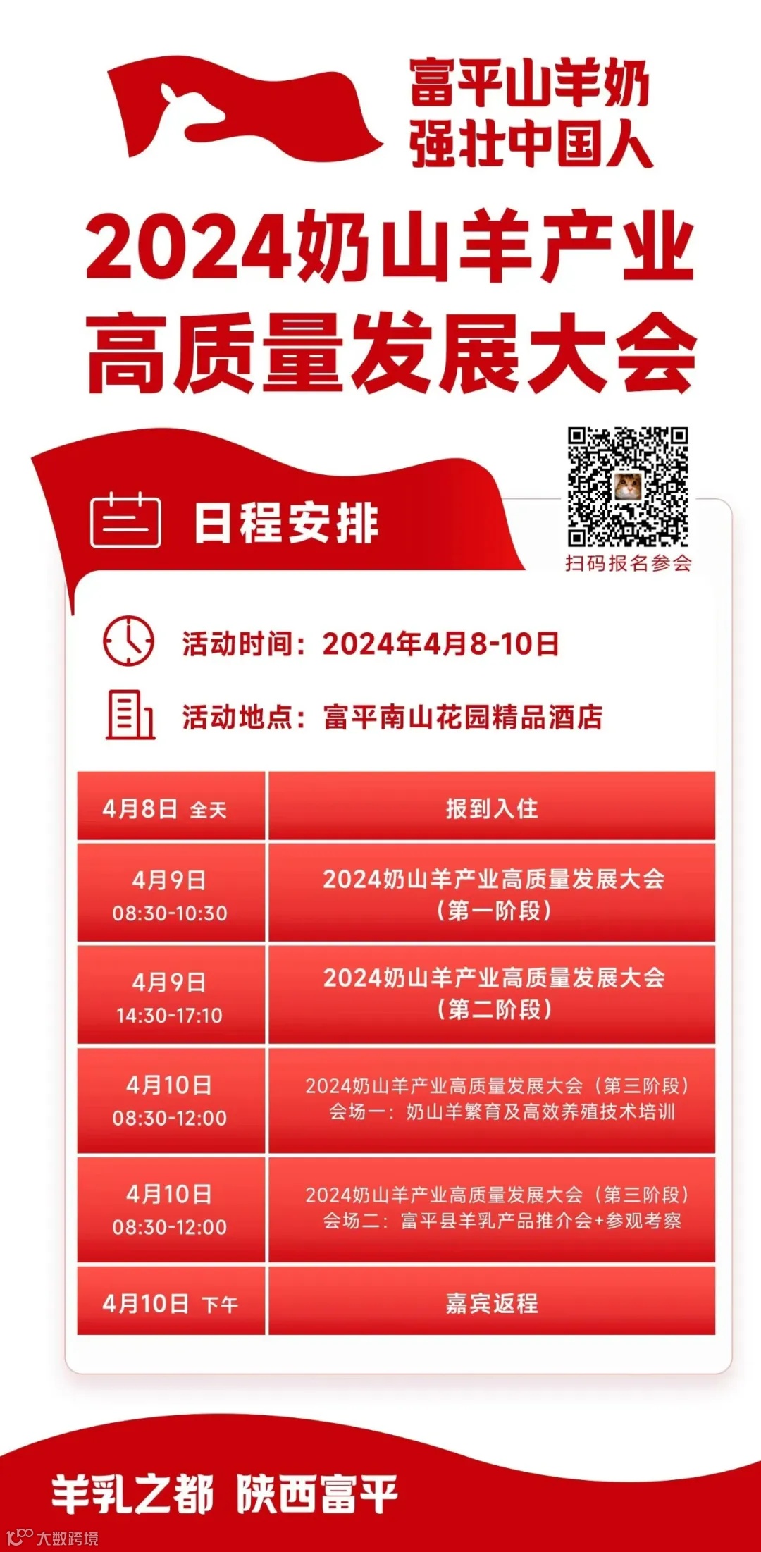 为推动奶山羊产业高质量发展,持续唱响富平山羊奶品牌,2024年4月8-10日,“2024奶山羊产业高质量发展大会”将在“羊乳之都”陕西富平隆重召开。