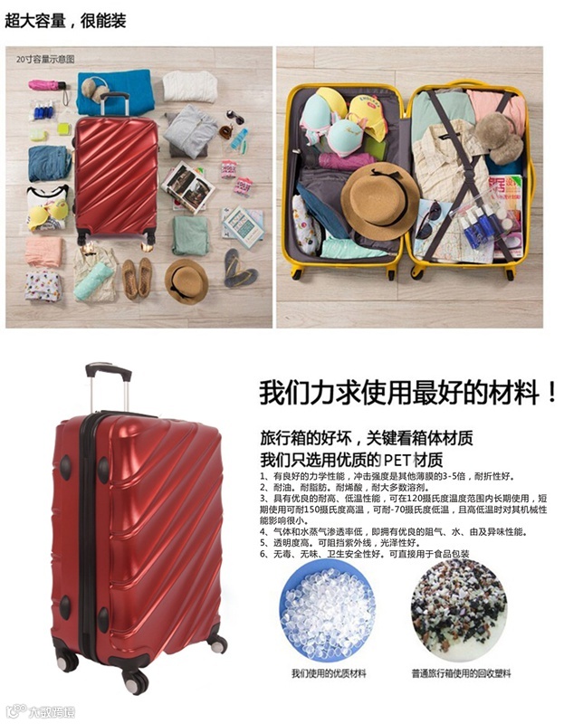 E起行品牌是国内领先的将PET作为旅行拉杆箱的箱体材料,设计研发了一下这款PET哑光剖面旅行拉杆箱,运用了今年时装周最流行的酒红、宝蓝、薄荷绿和银色等色调。一经推出市场得到了消费者的高度认可。各大展会、新品推介会大方异彩、独领风骚。