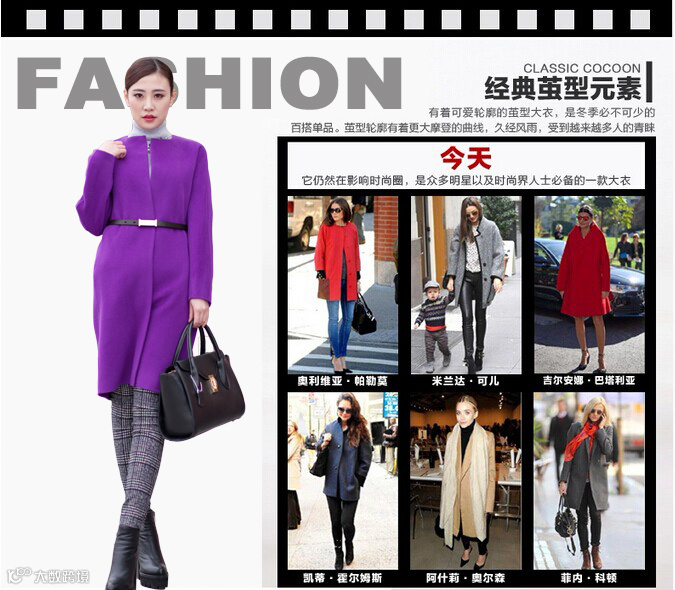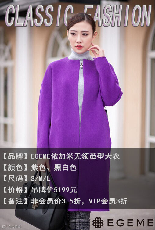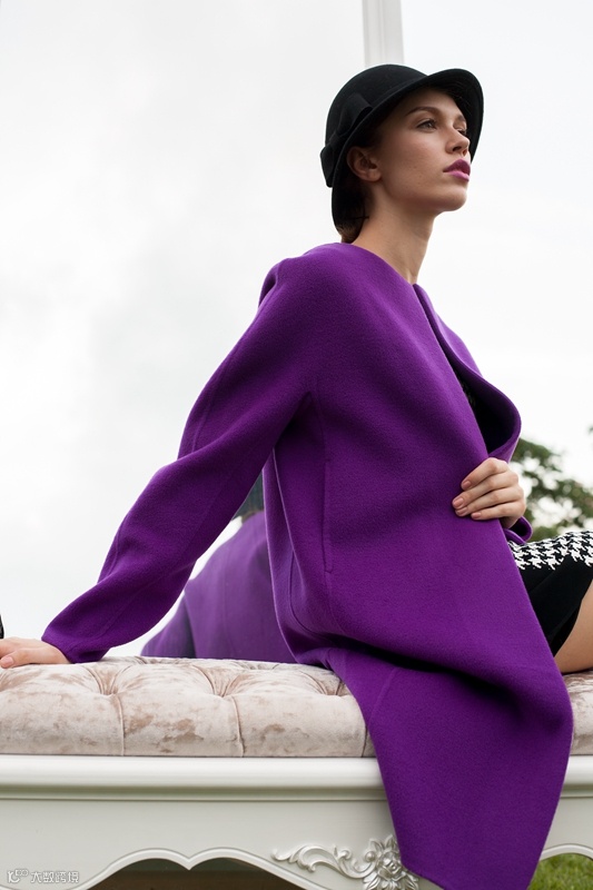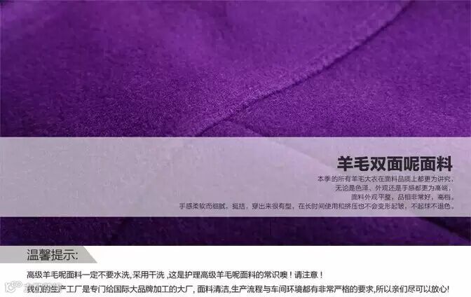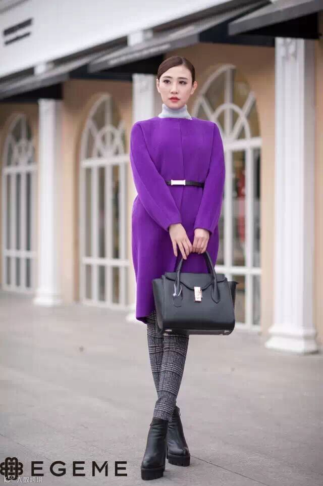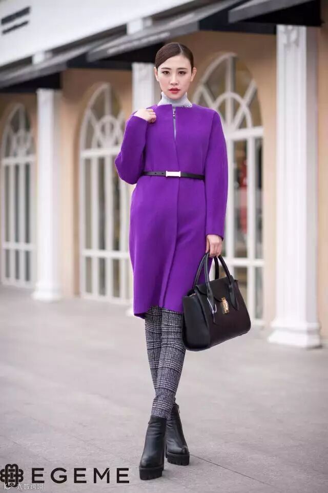 紫色彩呢很有春天缤纷的感觉,饱满优雅,很显白皙,很有气质的色彩,值得尝试哦!大气的廓形,腰部系带凸显时尚优雅感。中等长度,保暖又显高显瘦。——很少见到颜色这么漂亮的大衣,紫罗兰色,更是不多见,一上身,立马显出了优雅的气质!