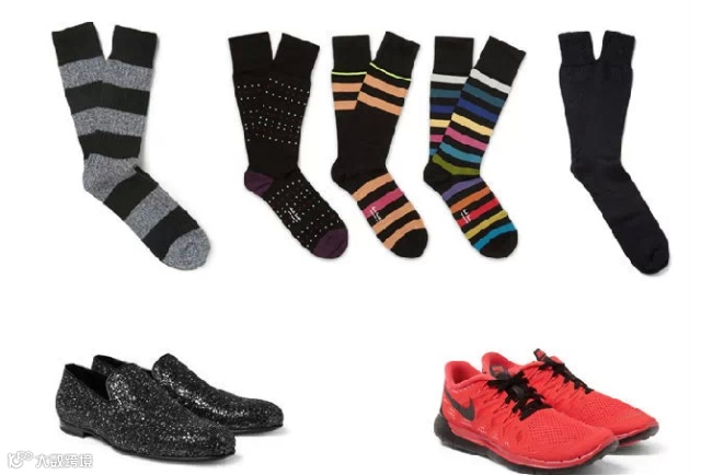 袜子应备有纯色款、条纹款和基础彩色款;鞋子应备有宴会皮鞋、普通皮鞋、靴子、运动鞋、便鞋和帆布鞋。这些都是考虑到了生活和工作中的不同环境与场合。