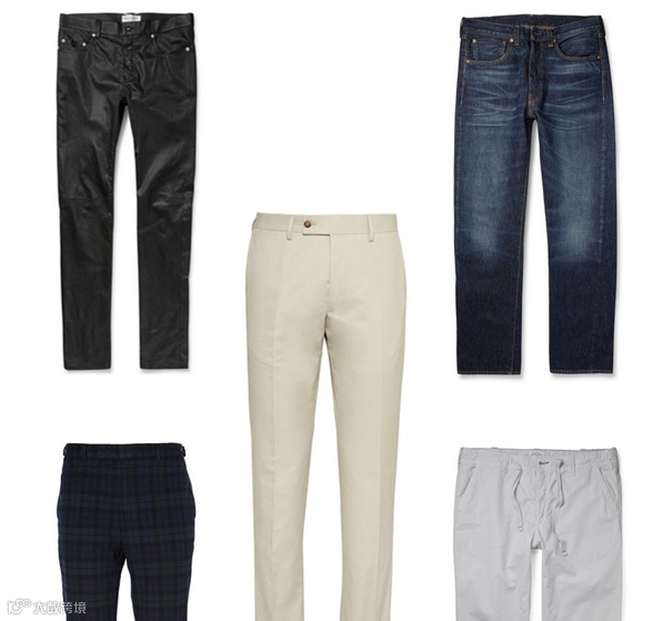 除了提到的三色西装中的西裤以外,你还需要准备素色西裤,此外还需要有牛仔裤、皮裤、休闲裤和格纹裤,这就基本满足了大部分风格的搭配需求。