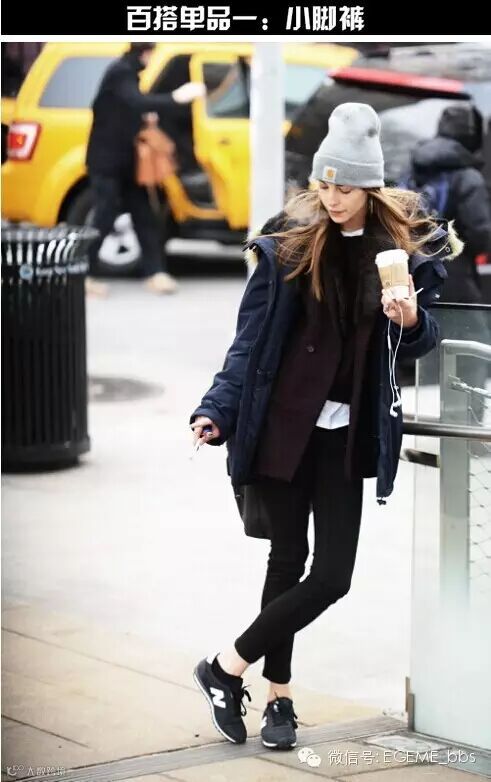 小脚裤可是最百搭的单品,无论搭配平底鞋、靴子还是运动鞋,无论穿着针织衫、皮夹克还是卫衣,选择它,准没错。小脚裤搭配平底鞋,上衣一件简单的白色吊带外穿短夹克,既休闲又时尚