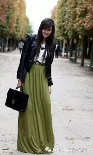 黑色皮夹克搭配绿色丝绸拖地长裙,意想不到的组合,但是效果奇好,柔美中带有一丝帅气。