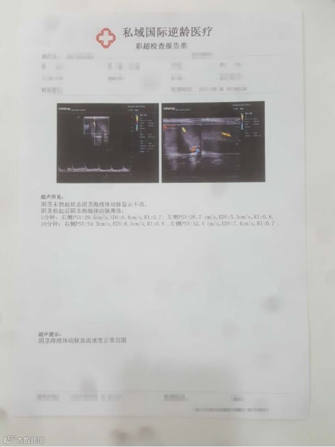 因此,经过男性功能全面检测:分别测量双侧阴茎海绵体动脉收缩期峰值流速(PSV)20,舒张开末期流速(EDV)18以及阻力指数(RI)1.6,硬度2级,敏感阈值10非常敏感,国际勃起功能评分表(IIEF-5)评分15,为中度功能障碍,性激素六项正常范围。