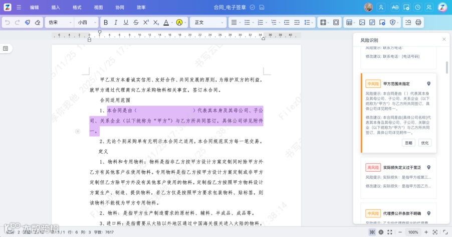 风险识别: AI自动识别条款缺失、表述模糊、不平等条款等风险。对识别出的风险,不仅提示,还给出专业修改建议,并支持一键纠正