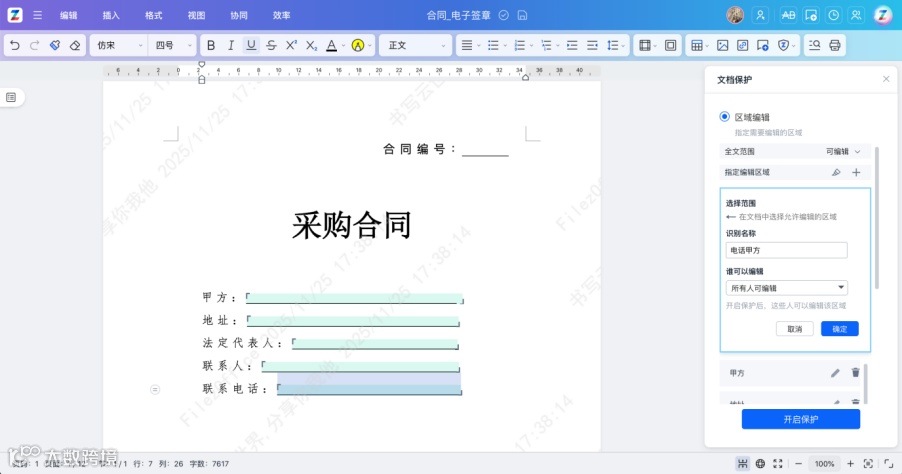 内容保护与区域授权: 可将合同不同区域授权给对应专人编辑,确保多人协作既高效又有序